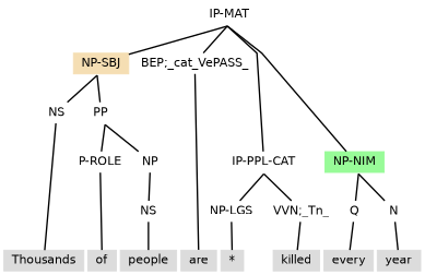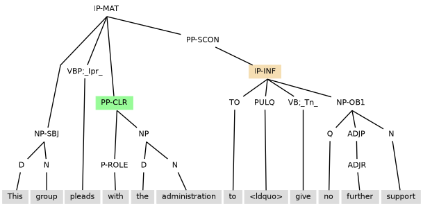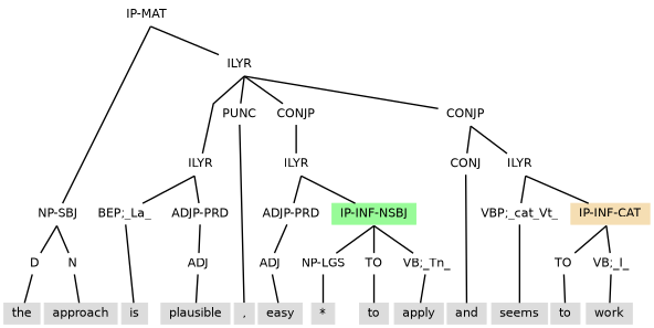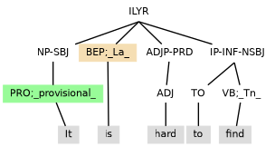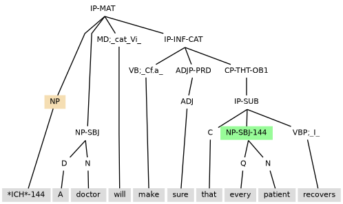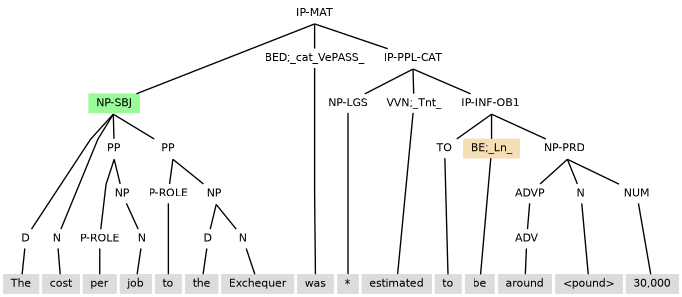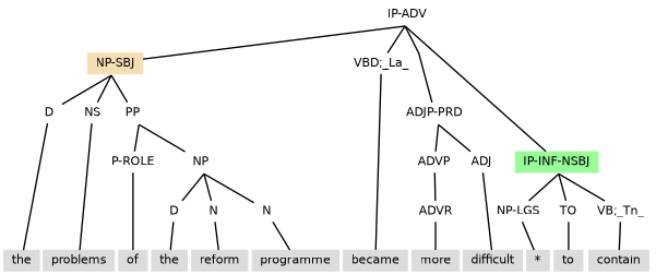 Tag extension -NSBJ marking a notional subject can also be seen when the clause has: (i) a subject marked -ESBJ occurring with existential there, as in (11.26); or (ii) a subject inherited from control, as with the environment created by the reduced relative clause (the IP-PPL under NP) in (11.27).