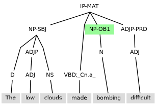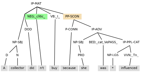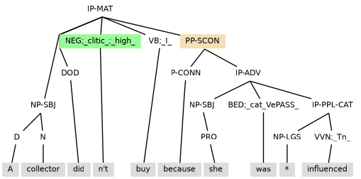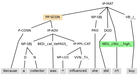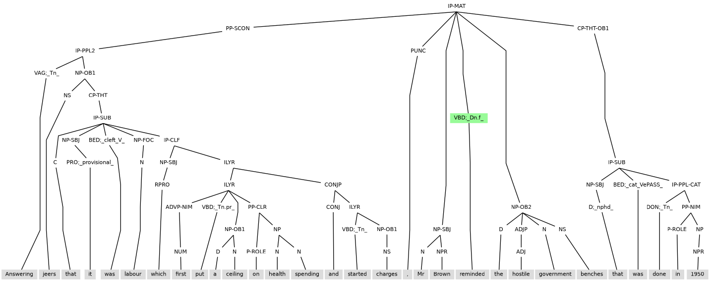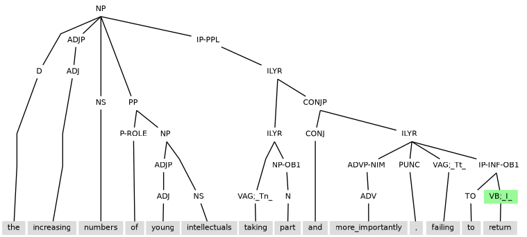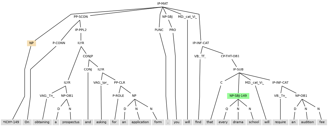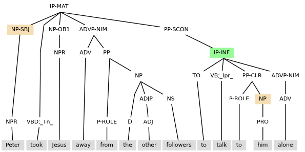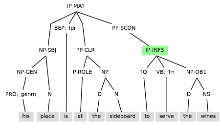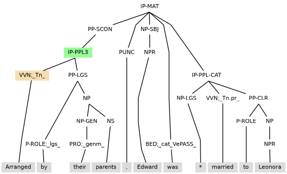 Example (11.34) contains an adverbial participle clause that contains a subject and so as is tagged IP-PPL3 (under PP-SCON) to ensure there is no control to disrupt the internal subject.