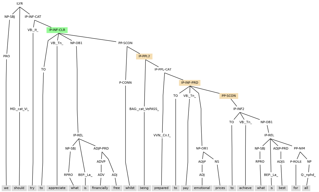 It follows that an ILYR instance will either (i) have a placement that is directly under a clause layer, as in (11.9); or (ii) have a placement that is either sister to CONJP layer(s) or directly under a CONJP layer, as with the examples of clause internal coordination in section 4.4. An ILYR is never sister to another ILYR.