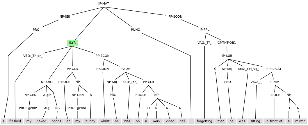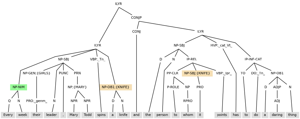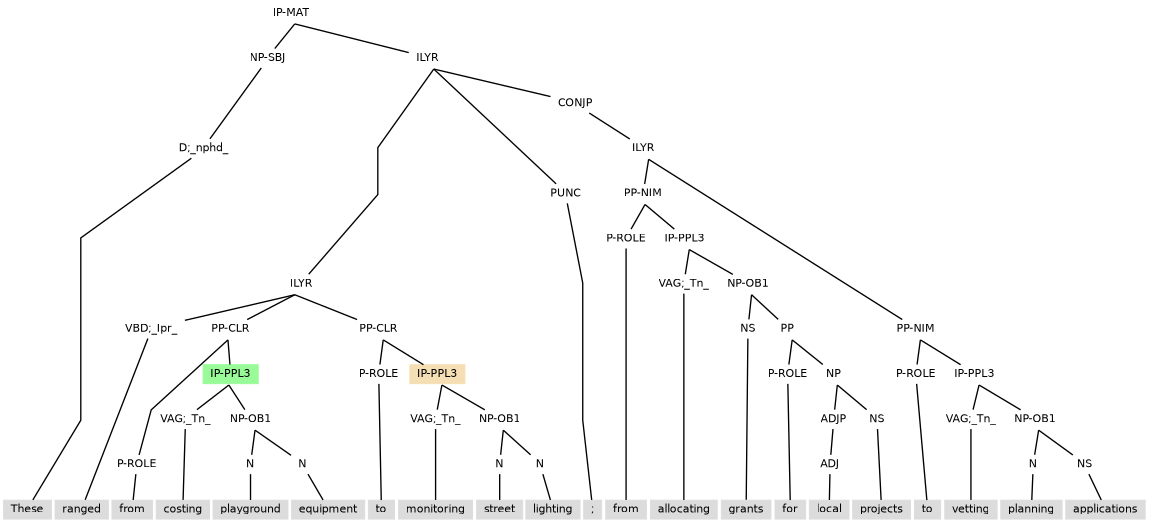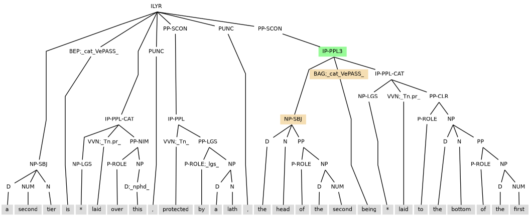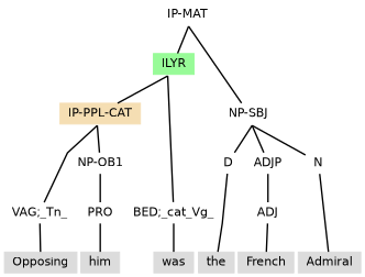 Examples above have IP-PPL-CAT structures that follow the subject, so that the IP-PPL-CAT is within the scope of the subject. The word order of (11.9) suggests content for an IP-PPL-CAT (Opposing him) that precedes the subject (the French Admiral), and yet inheritance of the subject is also needed. Subject inheritance is achieved by the placement of the IP-PPL-CAT under an ILYR projection that also contains the auxiliary verb. With this annotation, the ILYR projection functions as a direct embedding of the layer that contains it, so that all other content of the containing layer scopes over the ILYR, as if the ILYR had its content placed last in the containing layer.