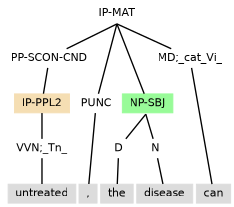No extra annotation is required for subject control to reach into an adverbial clause occurring within the same clause but prior to a subject. For example, in (11.16) the disease controls into the initial conditional adverbial to be the subject for the passive untreated.