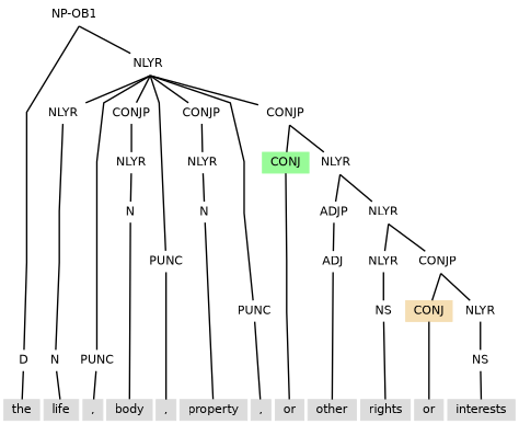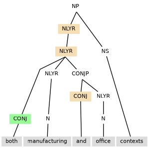 When the content of a noun phrase involves conjunction, all conjuncts are NLYR layers. Moreover, all conjuncts, except the first, occur directly under a CONJP projection. These CONJP projections are sisters to the first conjunct, all of which is placed under an NLYR layer.