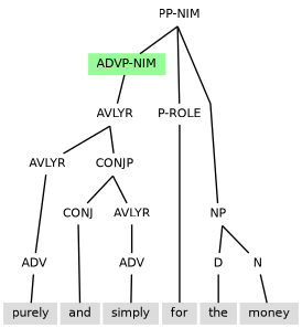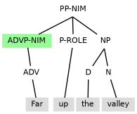 Adverb phrases function marked -NIM can modify prepositions (e.g. far up the valley, purely and simply for the money), verbs (e.g. strongly supported) and clauses (e.g. of_course you can).