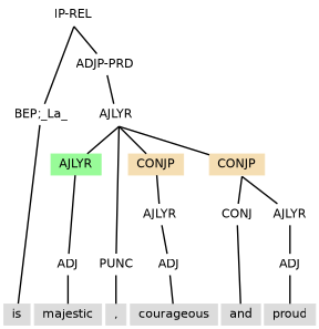 When the content of an adjective phrase involves conjunction, all conjuncts, except the first, receive a CONJP projection. This gives structure parallel to the conjoined NP structure of section 3.2.4, but with CONJP projections adjoined to the first conjunct under an AJLYR layer. CONJP layers exist irrespective of the presence of an overt CONJ head, as in (3.53).