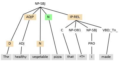 Possible dependents include: determiners (e.g. the pizza), adjective phrases (e.g. healthy pizza), nominal modifiers (nouns which modify other nouns, e.g. vegetable pizza), and relative clauses (e.g. pizza that I made). It is possible to have multiple dependents. For example, (3.2) is a noun phrase containing determiner the, adjective phrase healthy, nominal modifier vegetable, head noun pizza, and relative clause that I made.