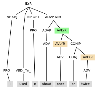 Example (3.32) also shows how the modifier of a head noun can involve noun phrase coordination internally. Note how there is an NLYR layer to introduce the modifier that immediately contains as its only daughter the NLYR layer that contains the conjuncts.