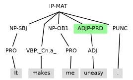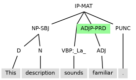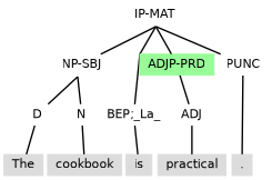 In a clause, an ADJP will typically have a predicative function, marked with the tag extension -PRD(2) (see section 4.3.3), and with a predicate position after verbs that include BE, APPEAR, SEEM, SOUND, MAKE (e.g. The cookbook is practical, This description sounds familiar, It makes me uneasy).