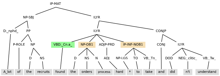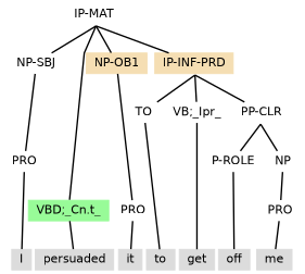 [Cn.t] is the code used to mark a complex-transitive verb in clause structure with a complex-transitive verb + a direct object that is a noun phrase (NP-OB1) + a predicative that is a to-infinitive clause (IP-INF-PRD). The predicative tells us what the object is made or helped to do or be.