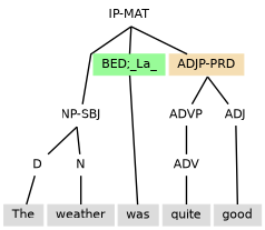 [La] is the code used to mark a linking verb in clause structure with the linking verb + predicative that is an adjective phrase (ADJP-PRD). The predicative describes some quality or feature of the subject. In (7.1), was is a linking verb with the predicative quite good adding information about the subject, the weather.