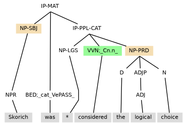 This contrast also shows how verbs will have different meanings when selecting either objects or predicatives: In (_7.57), FIND has the meaning ‘become aware of’; In (7.58), FIND has the meaning ‘discover something after search’.