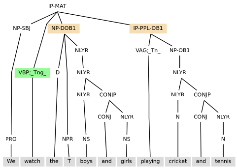 [Tng] is the code used to mark a monotransitive verb in clause structure with the monotransitive verb + a derived object that is a noun phrase (NP-DOB1) + a direct object that is a present participle ({ing}) clause (IP-PPL-OB1). The derived object noun phrase is the subject of the present participle ({ing}) clause.