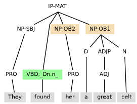 | C | COMPLEX-TRANSITIVE — is associated with both a direct object (-OB1) and an object predicative (-PRD), an element which provides more information about the direct object. Note: in the code, a dot divides information about the realisation of the direct object from information about the realisation of the predicative. |