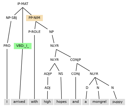In (7.6) there is the optional manner preposition phrase with high hopes and a mongrel puppy.