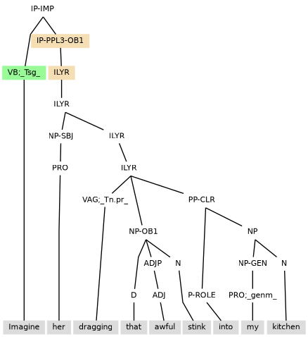 [Tsg] is the code used to mark a monotransitive verb in clause structure with the monotransitive verb + a direct object that is a present participle ({ing}) clause (IP-PPL-OB1) that contains as an initial element a noun phrase with subject function or possessive function.