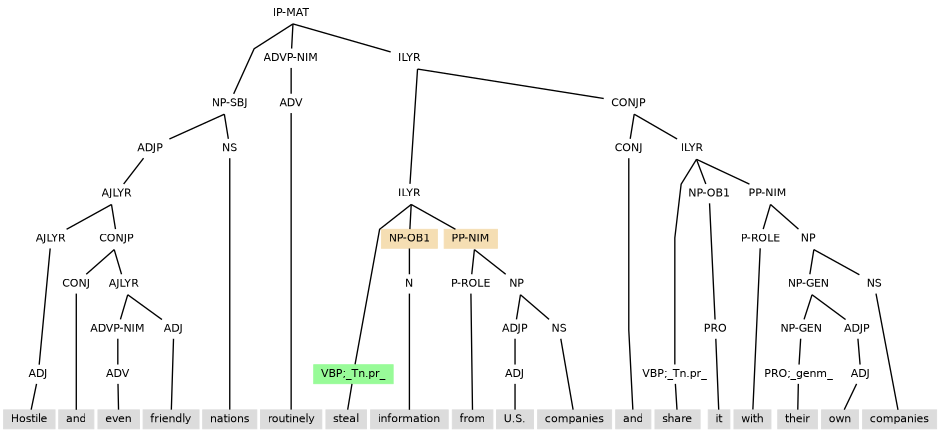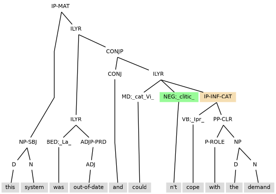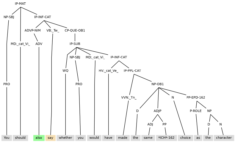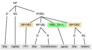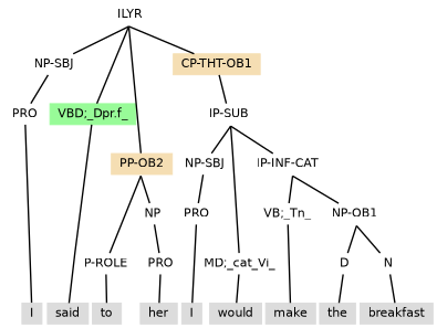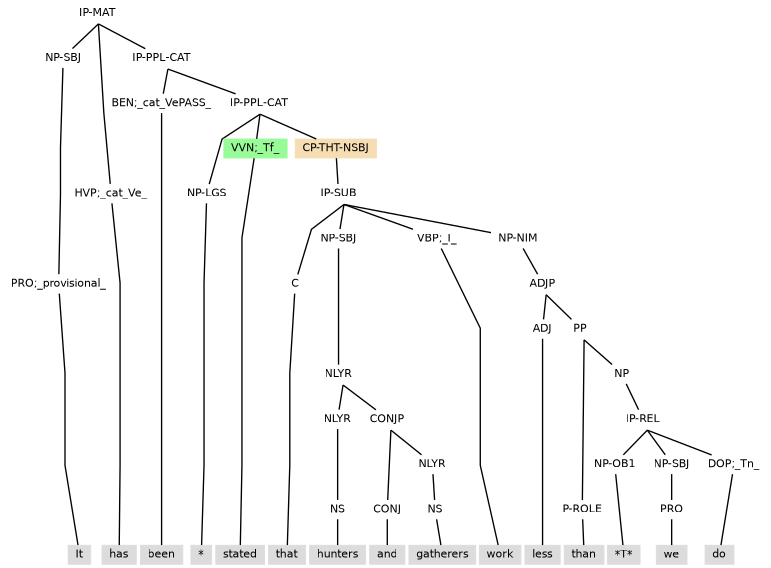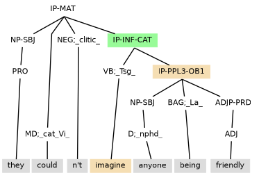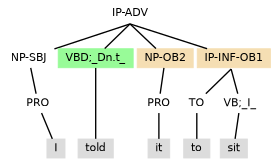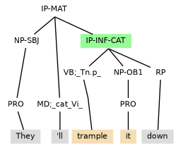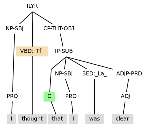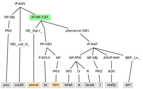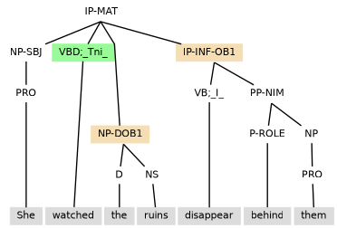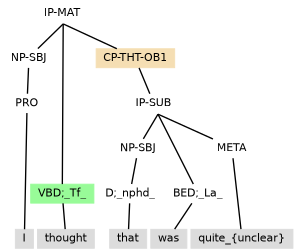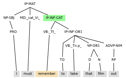 | t | non-finite clause (to-infinitive) (IP-INF with to tagged TO and verb tagged VB) |