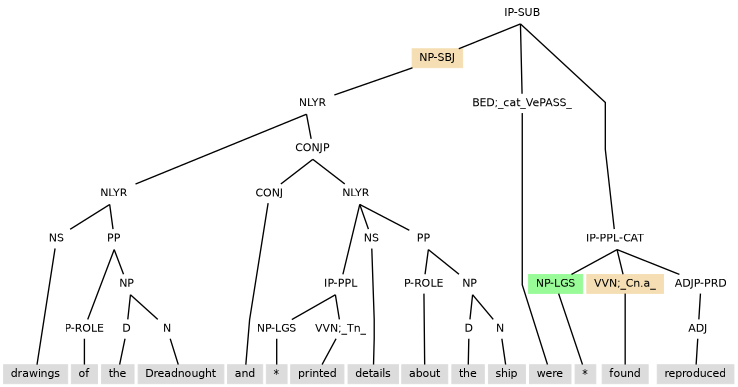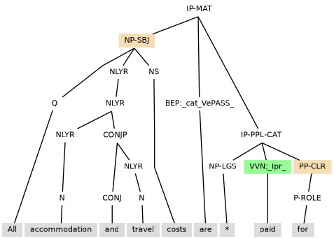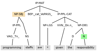 Note that the annotation of (7.11) makes no use of indexing to establish the link between the subject of the passive and its role with interpretation as the complement of the verb selected preposition phrase. (See chapter 10 for constructions that do require indexing.)