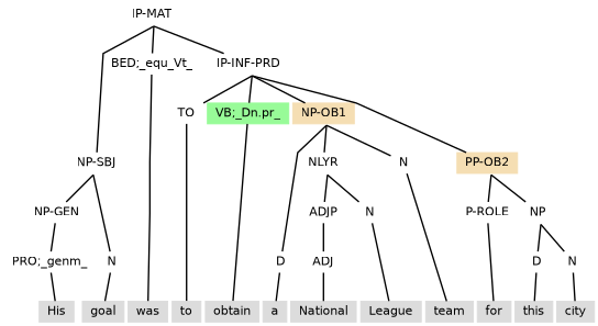 [Tnt] is the code used to mark a monotransitive verb in clause structure with the monotransitive verb + a derived object that is a noun phrase (NP-DOB1) + a direct object that is a to-infinitive clause (IP-INF-OB1). The derived object noun phrase is the subject of the to-infinitive clause.