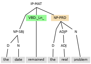 [Ln] is the code used to mark a linking verb in clause structure with the linking verb + predicative that is a noun phrase (NP-PRD). The predicative gives further information about the subject. In (7.4), remained is a linking verb with the predicative the problem to add information about the subject, the date.