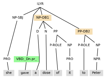 [Dn.pr] is the code used to mark a ditransitive verb in clause structure with a ditransitive verb + a direct object that is a noun phrase (NP-OB1) + an indirect object that is a preposition phrase (PP-OB2). The indirect object preposition phrase is typically placed at the end. It consists of a head word (tagged P-ROLE) that is to or for and a noun phrase.