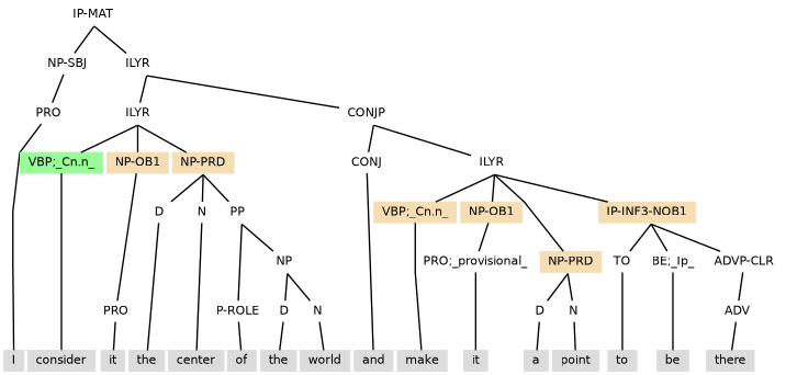 | C | COMPLEX-TRANSITIVE verb | is associated with both a direct object (-OB1) and an object predicative (-PRD), an element which provides more information about the direct object. Note: in the code, a dot divides information about the realisation of the direct object from information about the realisation of the predicative. | |