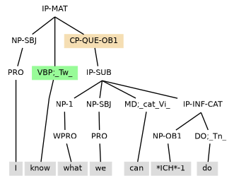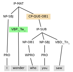 [Tw] is the code used to mark a monotransitive verb in clause structure with the monotransitive verb + a direct object that is a finite or non-finite clause with wh (CP-QUE-OB1).