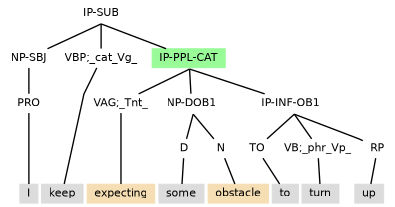 [Tg] is the code used to mark a monotransitive verb in clause structure with the monotransitive verb + a direct object that is a present participle ({ing}) clause (IP-PPL-OB1).
