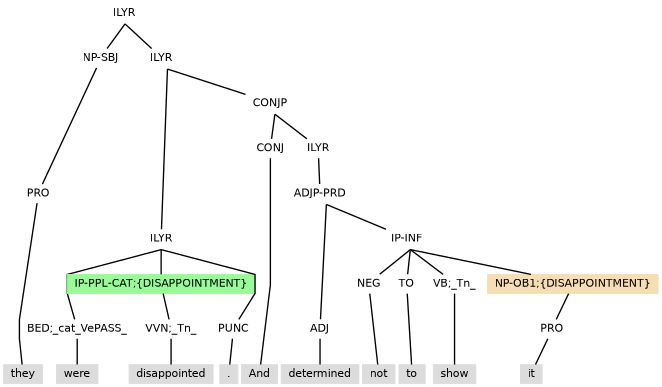 Example (9.1) has pronoun it with the witness information of ;{DISAPPOINTMENT}.