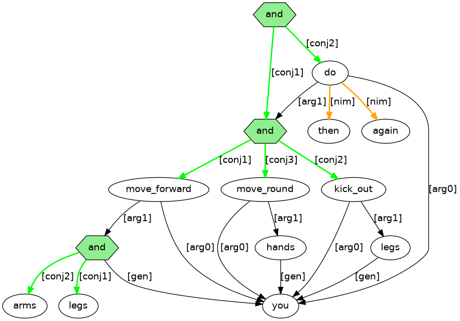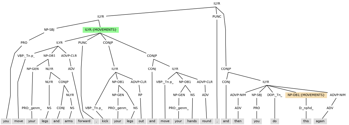 Example (9.5) has demonstrative pronoun this with the witness information of ;{MOVEMENTS}. There is annotation to construct a discourse referent with NP-DSC (DSC=discourse element) built from the projection of three zero pronoun elements that link to prior clause layer witnesses: ;{MOVE1}=an event for the first move, ;{KICK}=an event for kick, and ;{MOVE2}=an event for the second move.